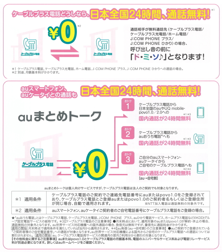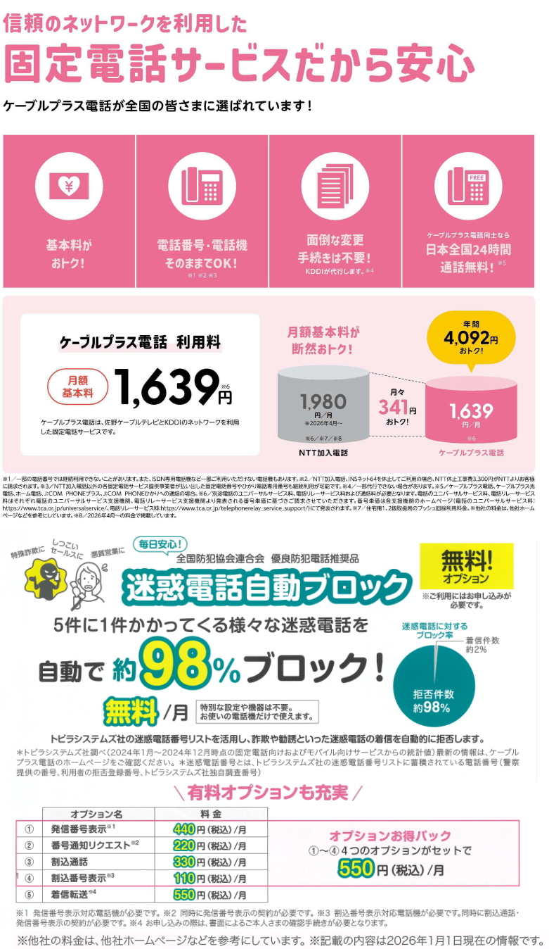 ケーブルプラス電話は、佐野ケーブルテレビとKDDIのネットワークを利用した固定電話サービスです。
